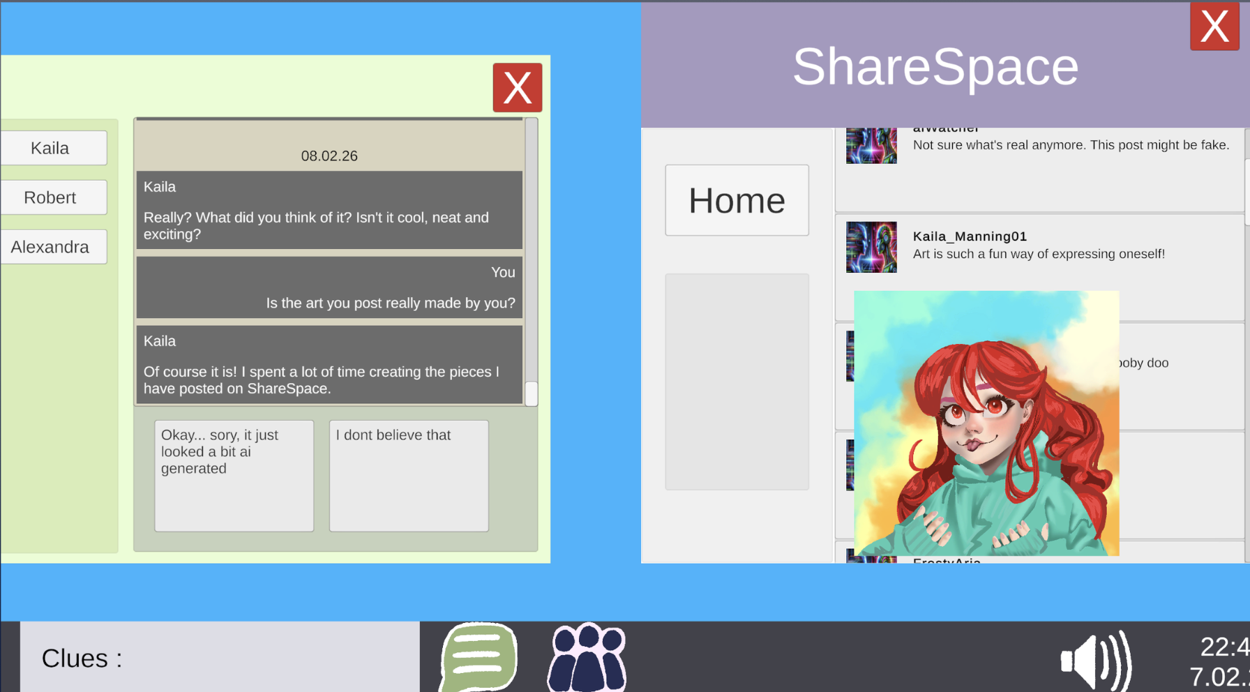 Kaila is a 2D game where you have to look through socialmedia to prove that the person you are talking to is in fact an A.I. chatbot.